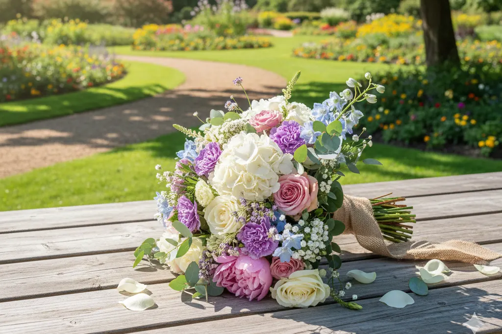 A beautifully balanced hand-tied bouquet featuring soft blush tones and seasonal blooms, perfect for romantic gestures and special occasions.
